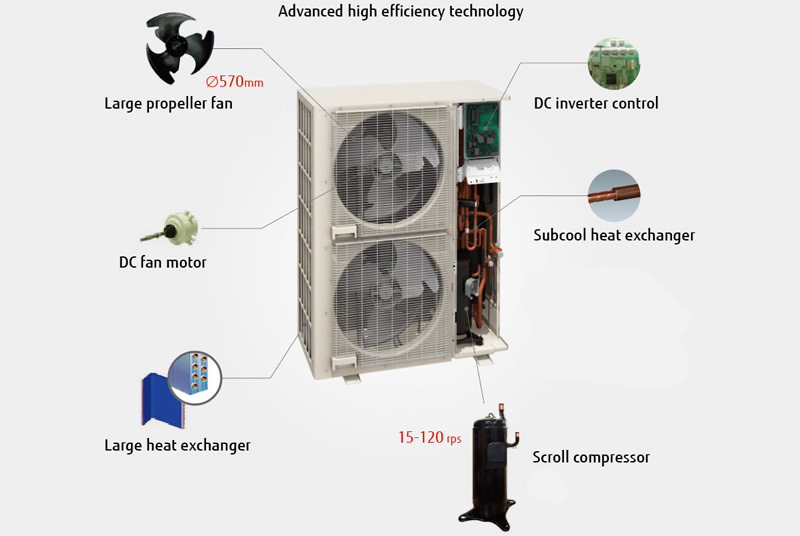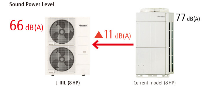 –  Постигнати са ниски нива на шум от 66 dB, чрез използване на голям спирален компресор и увеличаване размера на перката на външното тяло до ∅570 mm;