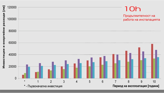 – На фиг. 3 са показани финансовите резултати на четирите системи. Върху първоначалните инвестиции са натрупани разходите за енергия в следващите 10 години, с отчитане поскъпване на енергията от 3% и поддръжка от 5% годишно.