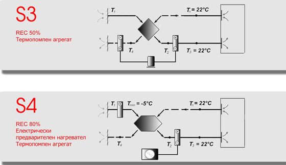 – Разгледани са четири типа системи (фиг.1), които работят на 100% пресен въздух и го подават към помещението с 22°C в зимен режим и преходните периоди. Първите две системи не предлагат възможност за охлаждане с презумпцията, че то не е необходимо или е осъществено от вътрешните инсталации на обекта.
