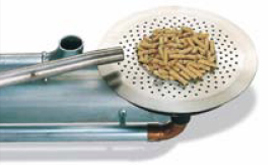 При първичното изгаряне пелетите се подават отдолу на горелката, без да смущават по този начин самия горивен процес. Образувалите се при това изгаряне дървесни газове се издигат до вторичния горивен цилиндър, където се инжектира допълнителен въздух и сместа от дървесни газове гори при около 800°C. В действителност, това е модулираща газова горелка, която използва дървесните газове. Тези горещи газове циркулират още веднъж около горивния съд осъществявайки допълнителен горивен процес, а след това се отвеждат, като отдават през топлообменика своята енергия на водата за отопление.