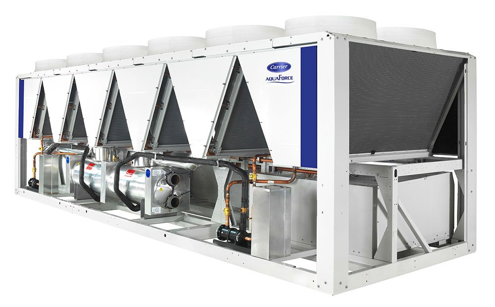– Carrier 06T двойно-роторни винтови компресори с постоянна скорост, оборудвани с високо ефективни двигатели и вентил с променлив капацитет, който позволява точно съчетаване на отдаваната охладителната мощност с товара на сградата.