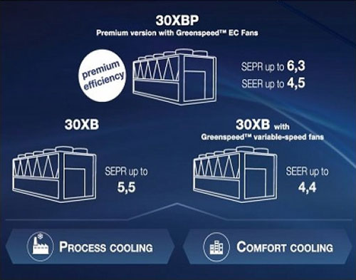 Водоохлаждащите агрегати с въздушно охлаждане 30XBP с технология Greenspeed® са премиум версия оборудвана с ЕС вентилатори и допълнителна топлообмена повърхност, които подобряват енергийната ефективност, както при пълен, така и при частичен товар. Благодарение на ЕС вентилаторната технология, 30XBP осигурява голяма икономичност при индустриални приложения или сградна климатизация.