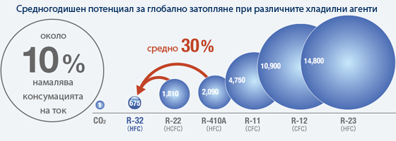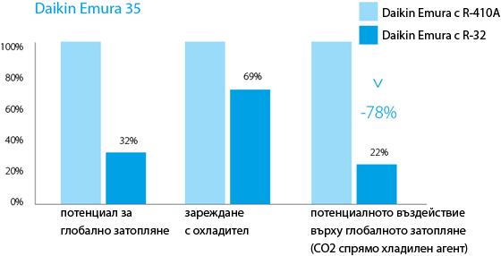 Според новите европейски разпоредби за флуорирани парникови газове, въведени в началото на тази година, предлагането на пазара на нови климатици с единична сплит система с R-410A (включително и термопомпи „въздух-въздух“) ще бъде забранено от 2025 г. – от този момент ще бъдат позволени само хладилни агенти със стойност на GWP (потенциал за глобално затопляне) под 750. Моделите на Daikin с хладилен агент R-32 вече изпълняват това изискване – 10 години преди крайния срок!