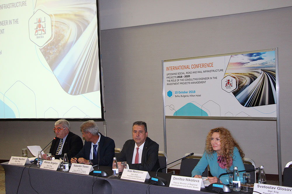 По-рано днес заместник-министър Деница Николова и заместник-министър Валентин Йовев участваха в международната конференция “Предстоящи, социални, пътни и железопътни инфраструктурни проекти 2018-2020 г. и ролята на консултанта при управление на инвестиционни проекти“, организирана от Българската асоциация на архитектите и инженерите – консултант.