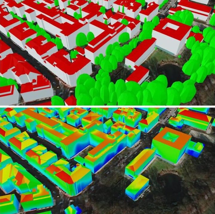 В тясно сътрудничество с екип, ръководен от проф. Томас Х. Колбе от Техническия университет в Мюнхен, изследователите на IOER моделираха и визуализираха слънчевата светлина, падаща върху всички покривни и фасадни повърхности, за да определят прецизно малкия потенциален добив на слънчева енергия . За да направи това, екипът не само се възползва от подробни модели на сгради, включващи индивидуални дизайни на покрива; изчисленията също са взели предвид заобикалящата среда като дървета и сянката, която хвърлят, или сенки, причинени от други сгради, както и местната топография и всякакви близки планини.