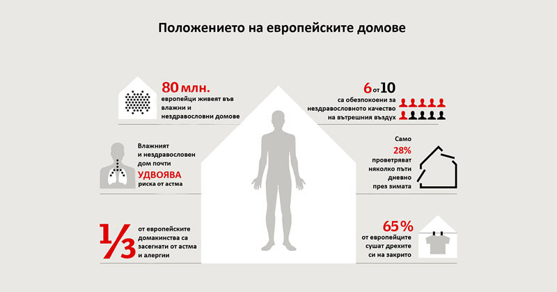 Като се има предвид състоянието на настоящия сграден фонд на Европа и нагласата на европейците, документирана в Барометър на здравословния дом 2015 г., европейците са може би твърде оптимистични по отношение на вътрешния климат у дома. Ново проучване на Института по Строителна физика Фраунхофер от 2014 г. показа, че 80 млн. европейци живеят в домове, които са влажни. Влажните домове имат нездравословен климат, който почти удвоява риска от развитие на астма. С други думи, ако европейците са по-наясно с това колко са нездравословни домовете им, те вероятно няма да са толкова толерантни.