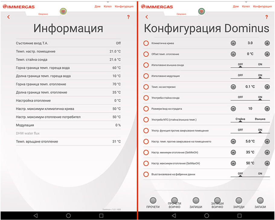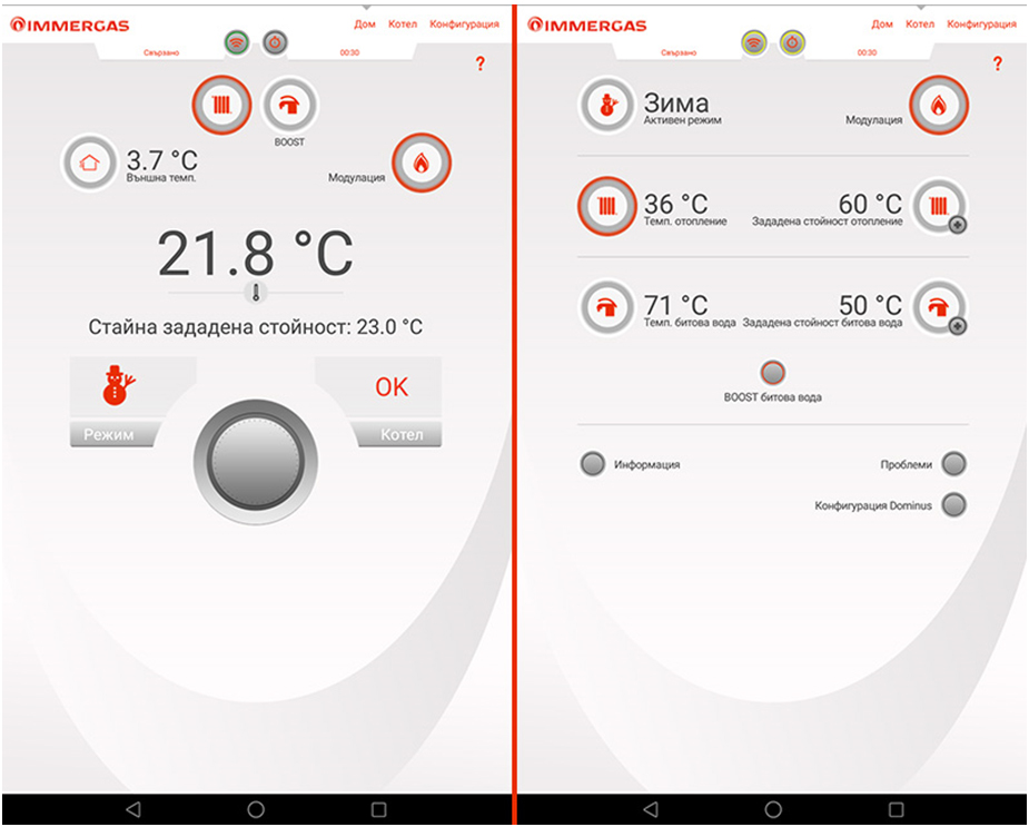 Различните термостати имат различни видове настройки, но всички те предлагат някои стандартни предложения, за да ви улеснят в програмирането им. Модемът на комуникационната система Dominus, например, се свързва с всяка домашна безжична интернет мрежа и може да работи с всеки тип стаен термостат или с дистанционните контролери от серията CARv2 на Immergas. Фабрично комплектованата в доставката на модема температурна сонда може да бъде конфигурирана за следене на външната температура или като стаен температурен сензор.