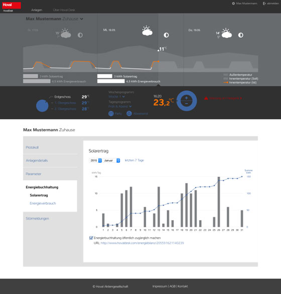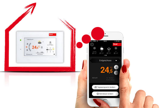 Можете да регулирате мощността на отоплителната система директно от съоръжението, от дисплея на стайния контролер (например в хола), от лаптопа си или компютъра, и чрез смартфон, където и да сте. Независимо от избрания начин на контрол, работата със системата е максимално опростена. От лаптопа или компютъра си, може да видите разпределението на температурата и консумацията на енергия не само като количество, но и като графика. Ето и нещо полезно и интересно: Ако знаем, че в даден ден ще се приберете у дома по-късно от обичайното, можете да намалите отоплението само с няколко кликвания от сматрфона си. Така ще спестите излишен разход на енергия. Или ако вече имате изградена отоплителна инсталация с Hoval съоръжения, например газов котел, то много лесно може да надградите системата с покривни слънчеви колектори за затопляне на битова гореща вода, като контролът на новата соларна инсталация  ще се регулира от Вашия TopTronic® E, който вече е доставен с котела.  Благодарение на това, цялата инсталация за отопление и топла вода ще бъде постоянно под контрол.