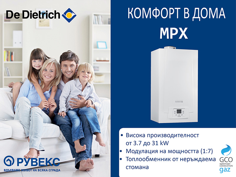 Ако имате нужда от здрав и надежден котел във всяко едно отношение с топлообменник от неръждаема стомана и месингов хидроблок, изберете НОВИТЕ стенни газови кондензни котли De Dietrich серия МРХ! Компактни по размери, версии само за отопление или комбинирани с БГВ, удобни за бърз и презпроблемен монтаж на всякакви места.