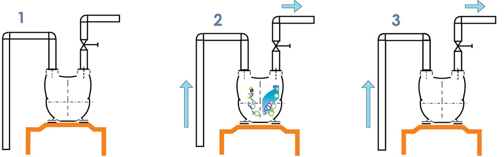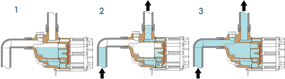 На схемата долу са показани трите работни фази на модела – 1. Фаза на покой; 2. Фаза на самозасмукване; 3. Фаза на изпомпване.
