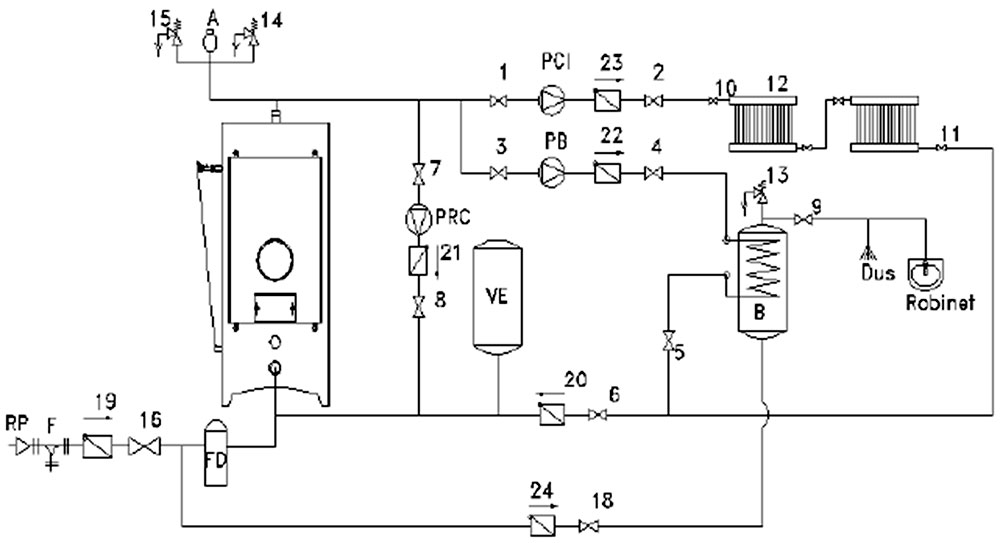 Котелът е предназначен за свързване към система с отворен разширителен съд. Котелът може също да бъде свързан и към разширителен съд от затворен тип, ако е оборудван със серпентина против прегряване (алтернативно).