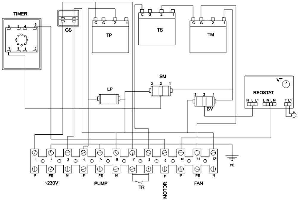 TS – Предпазен термостат; SM – Превключвател на мотора;