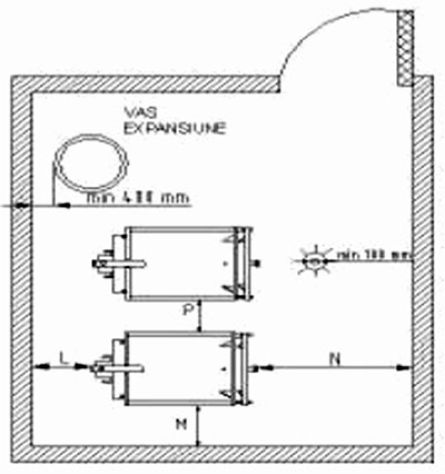 Разстояние между два котела (Р) трябва да бъде поне 1 м.
