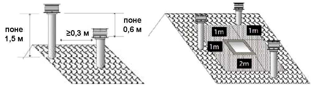 Височината на комина трябва да надвишава височината на покрива с поне 1 м. Ако върху покрива има други препятствия,  височината на комина трябва да ги надвишава с поне 1 м. Ако има множество комини, минималното разстояние между тях трябва да бъде 0,3 м.