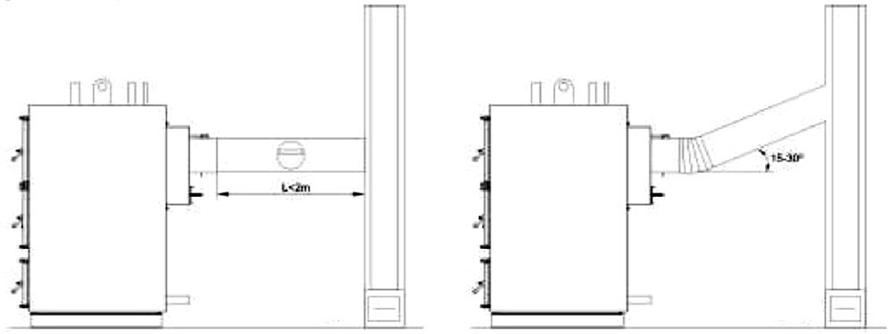 Хоризонталната част, свързваща тръбата на комина с вертикалния комин, трябва да бъде с максимална дължина от 2 м. Ако това разстояние е по-голямо, препоръчва се наклонът нагоре да бъде 15-30°. Връзката на тръбата на комина с котела трябва да бъде херметична.
