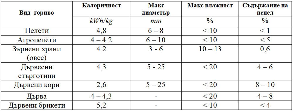 Горивото с  най-добри качества, взимайки пред вид калоричността му, съдържанието на пепел, влажността и стандартизацията, са дървените пелети. Колкото е по-лошо качеството на горивото, толкова по-голямо количество гориво ще трябва да се осигури за постигане на номинална производителност и разбира се, с по-голяма консумация и остатъци от пепел.