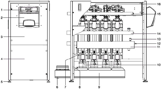 9 – кутия димни газове 10 – дренаж 11 – колектор връщаща вода 12 – щуцер за датчика на връщащия колектор 13 – пресостат вода 14 – колектор подаваща вода 15 – колектор за газ 16 – горелка |