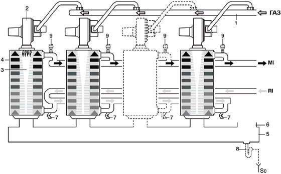 8 – сифон за източване на кондензат 9 – обезвъздушител MI – подаваща вода RI – връщане тръба ГАЗ – вход газ Sc – източване |