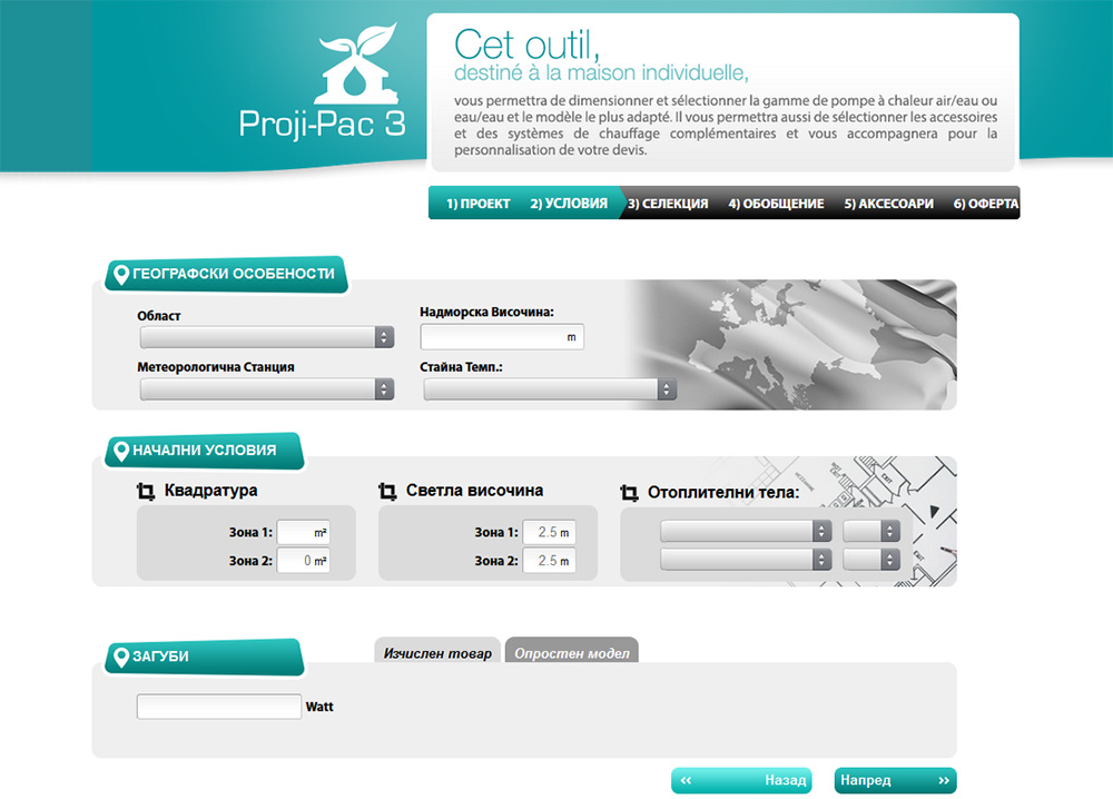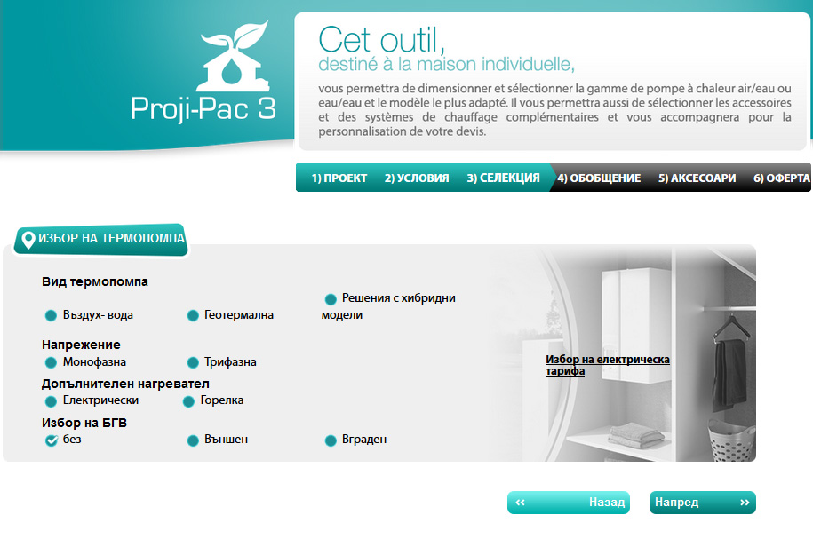 В зависимост от избраните характеристики, нуждите на клиента и параметрите на жилището, софтуерът ще представи няколко варианта за избор на термопомпа, от които може да се избере най-подходящият на база техническите параметри на предложените машини. Предоставена е възможност за избор и на аксесоари, след което се генерира оферта с направената селекция.