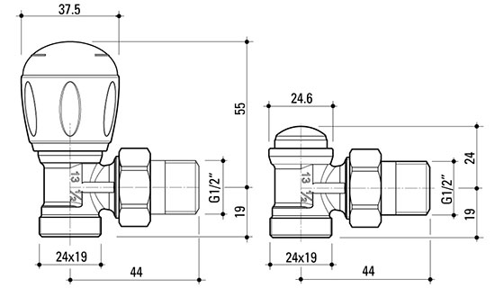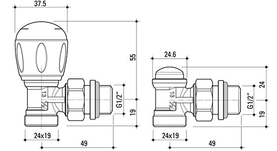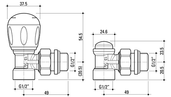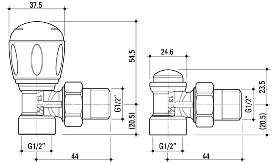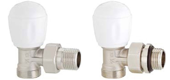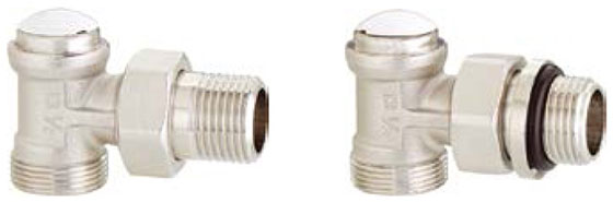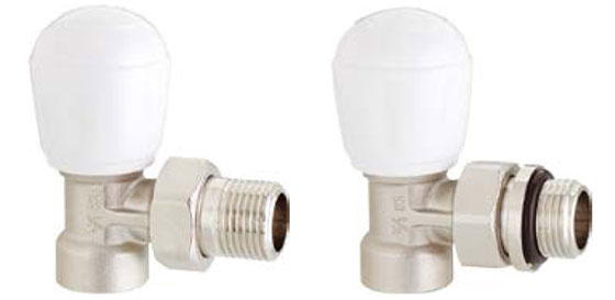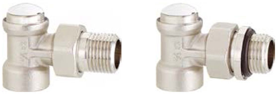 Ъглов радиаторен вентил с ръчно регулиране за медна и многослойна тръба.
