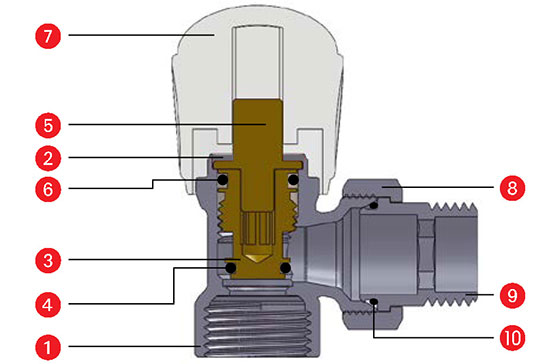 1. Корпус на вентила направен от месинг ST UNI EN 12165 CW617N с покритие от никел;