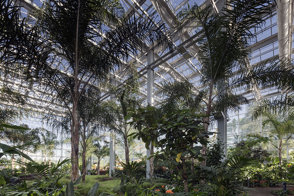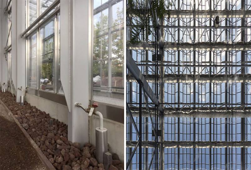 Haas Architects разработиха иновативно решение за отопление на тропическата зала: В стоманените профили на фасадната конструкция циркулира топла вода с температура 40 градуса. Фасадното отопление не само излъчва топлина в интериора на оранжерията, но и предотвратява кондензацията във вътрешността на стъклото дори при зимни външни температури. Новият стъклопакет с прозрачно стъкло осигурява висока обща светлинна пропускливост от 84%, за да може в парника да проникне жизненоважната за растенията ултравиолетова радиация.