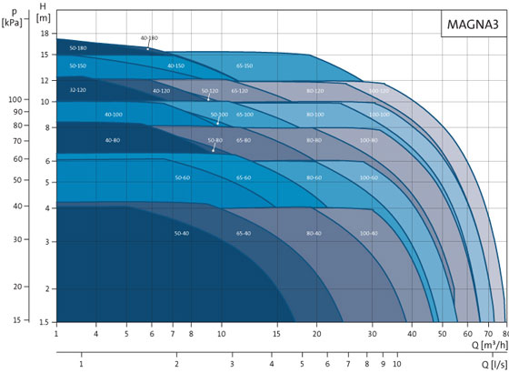 Циркулационни помпи с „потопен ротор“ за отоплителни, охладителни, геотермални, соларни системи и системи за БГВ. Благодарение на конструкцията си помпите не се нуждаят от поддръжка и имат изключително ниско ниво на шум. Помпата MAGNA3 е подходяща за пренос на разтвор на етилен-гликол и вода, ако съдържанието на етилен-гликол не превишава 50%.