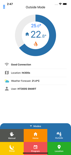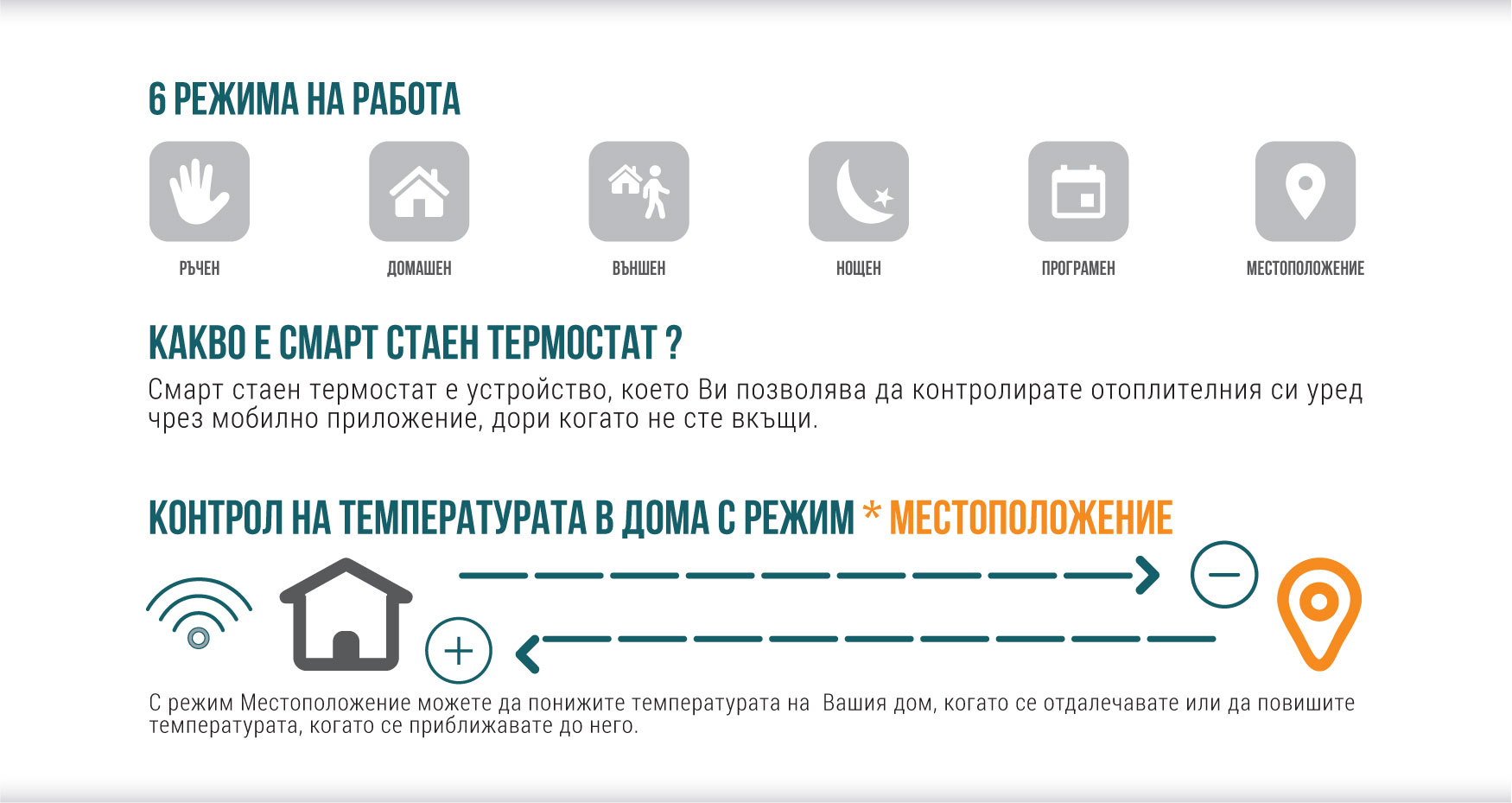 Без значение къде се намирате по света, можете да контролирате температурата в дома си, благодарение на мобилното приложение. С негова помощ, можете да създавате практични дневни и седмични програми. Използването на режим за местоположение намалява температурата, когато се отдалечавате от дома си, или я повишава, когато се приближавате до Вашия дом.